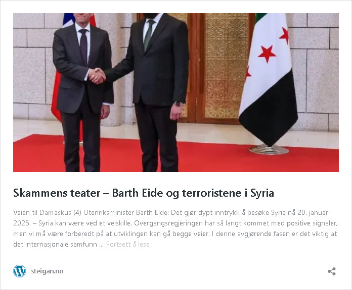 Det er jo en utrolig argumentasjonsutvikling. Noe som bare er mulig fordi alle medier — fordi det finnes knapt en eneste journalist, langt mindre en politisk journalist i Norge — som ikke kryper med nærmest genetisk entusiasme for utenlandske interesser. I tillegg kryper rundt ni av ti stortingsrepresentanter alle for alle utenlandske interesser.