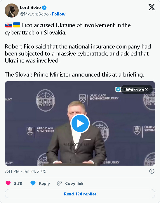 Slovakias statsminister Robert Fico sier at Slovakias nasjonale forsikringsselskap har blitt utsatt for et «massivt nettangrep» og hevdet at Ukraina var involvert.